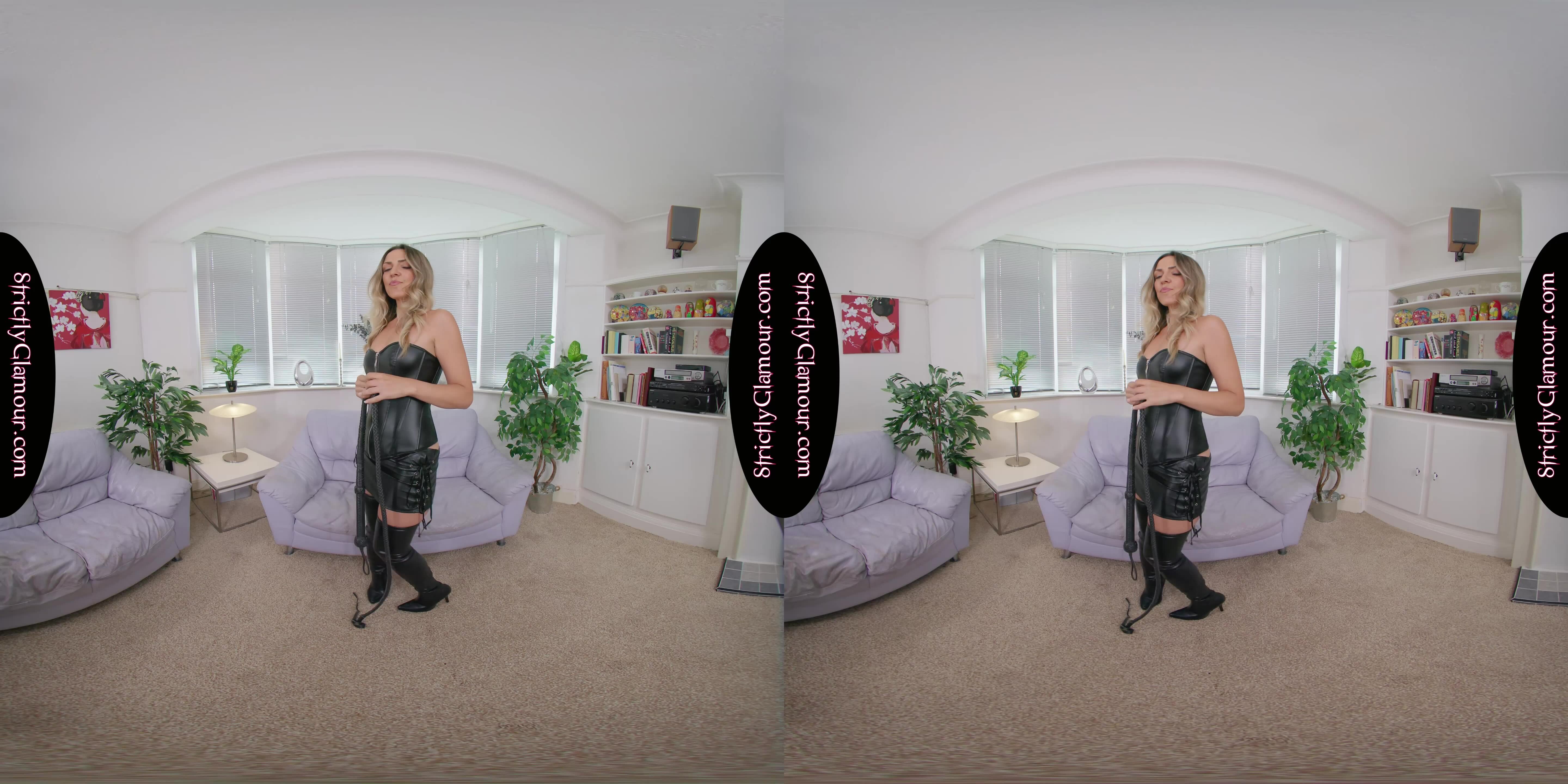 8K VR Video from shoot with Miss V wearing a black outfit comprising; black leather corset/top with zipper & back laces (sans bra), black mini skirt with side laces and back zipper, black thong, and over-the-knee high-heeled boots, in a strict tease performance to topless.