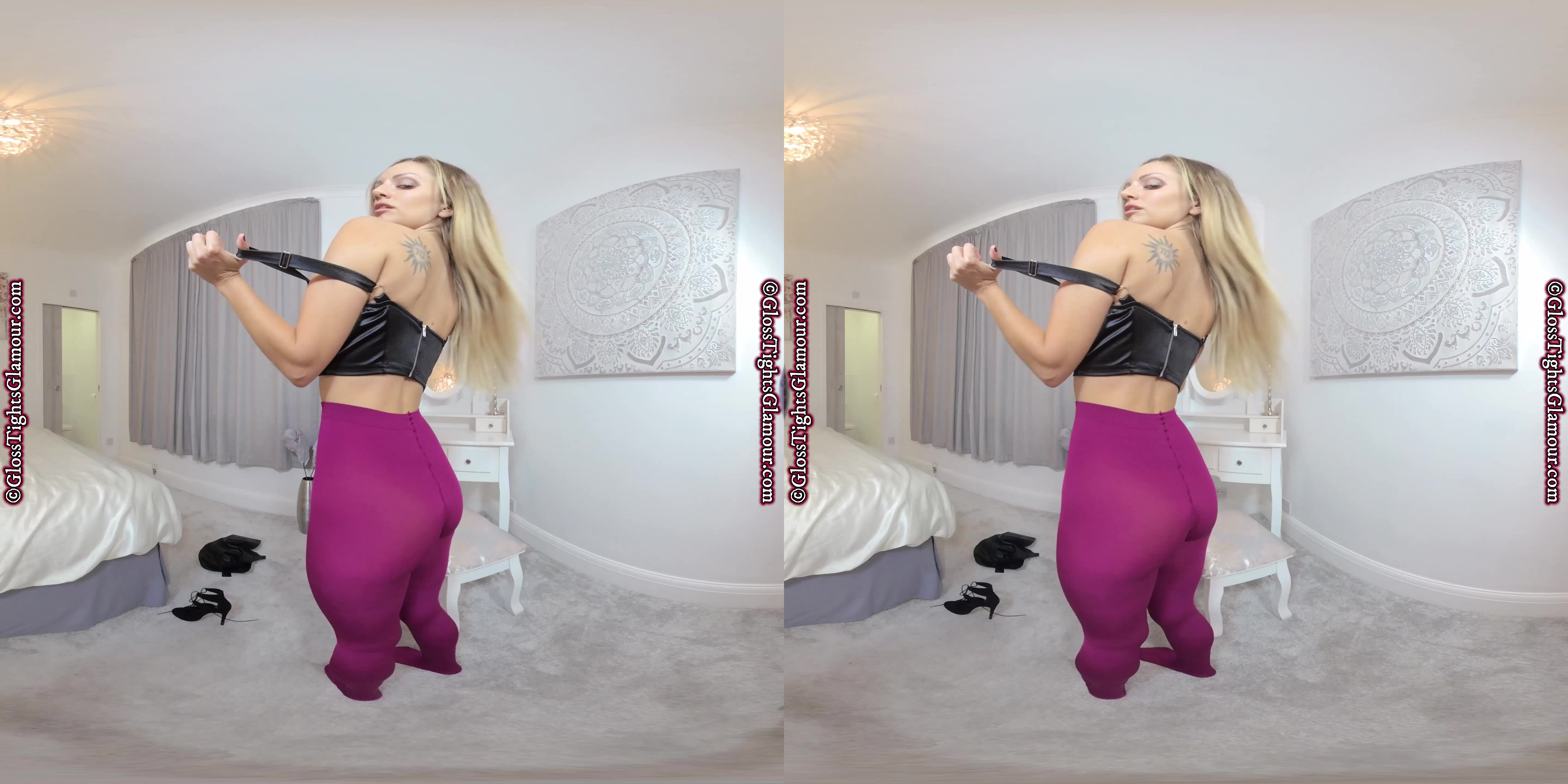 Supernova Suzi Star looks ‘out of this world’ and very fruity in this VR video showing off her plum coloured glossy tights/pantyhose and more besides – if you make it to the end you will definitely be rewarded!