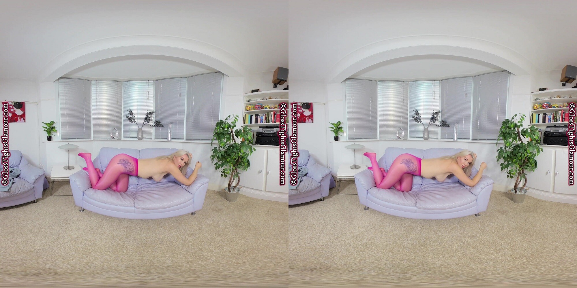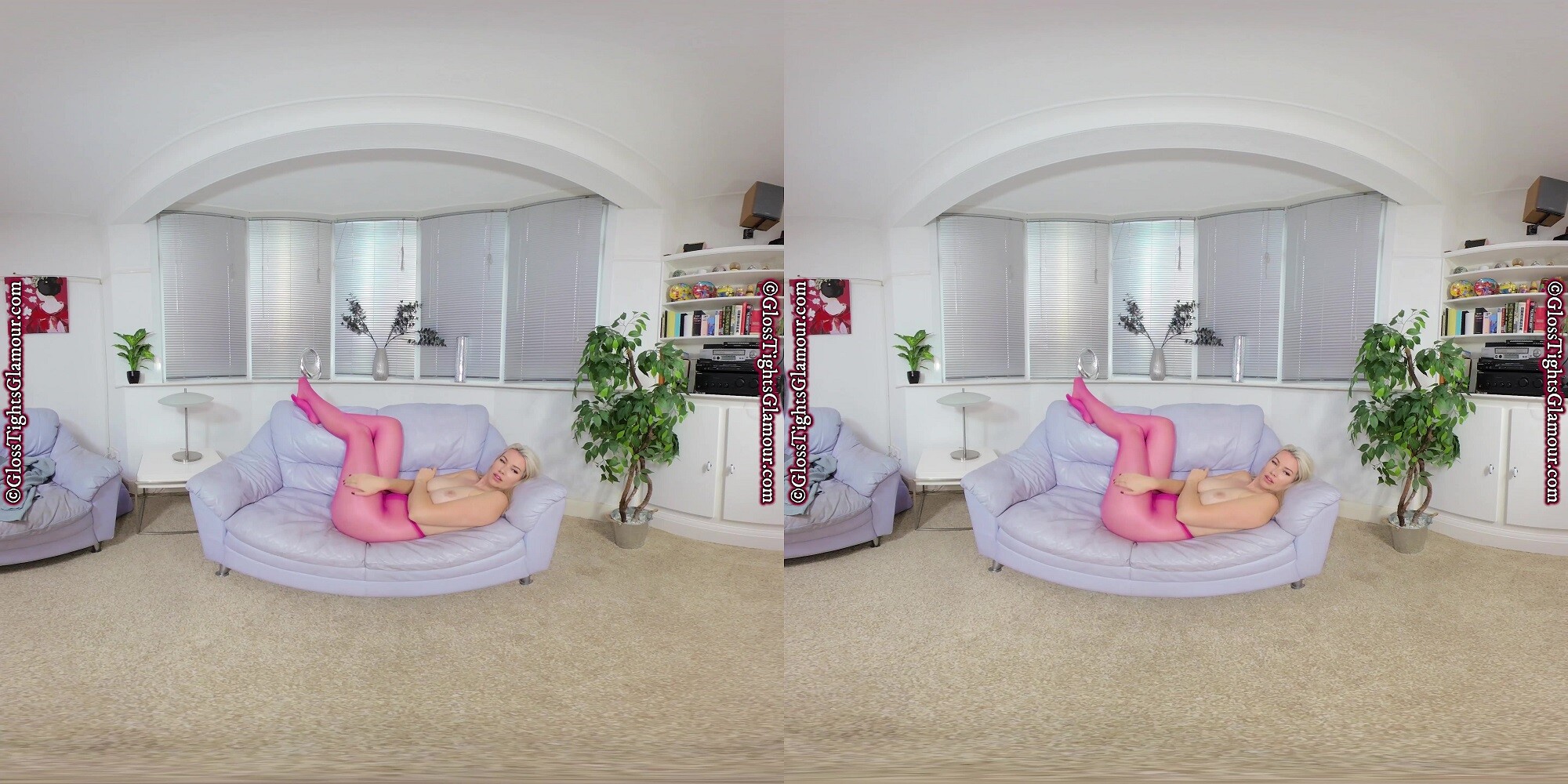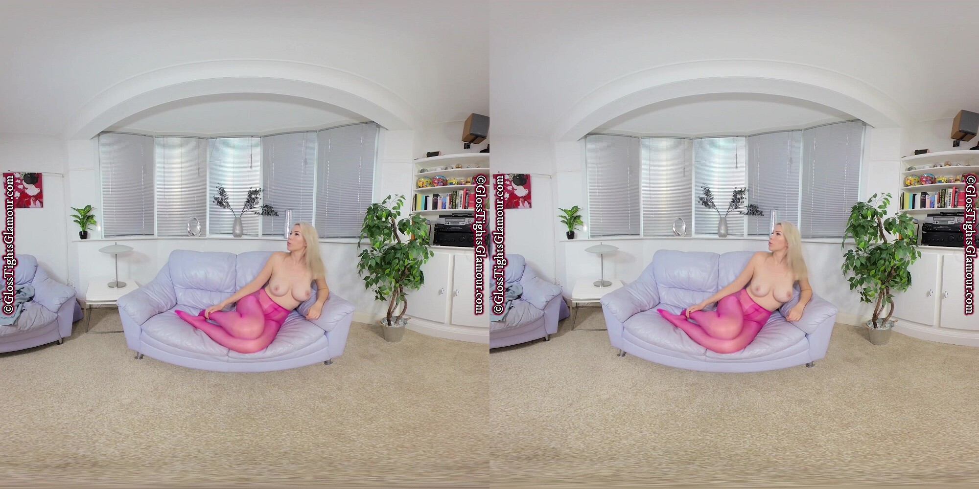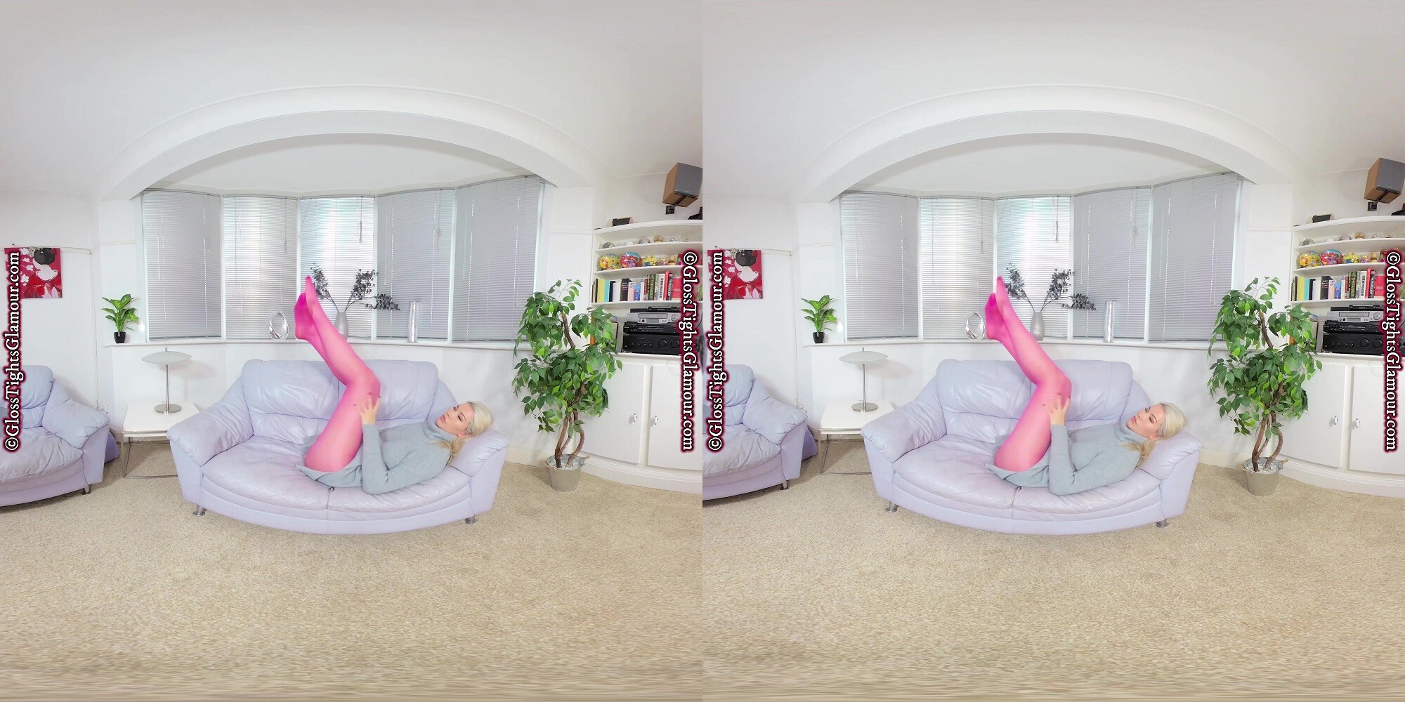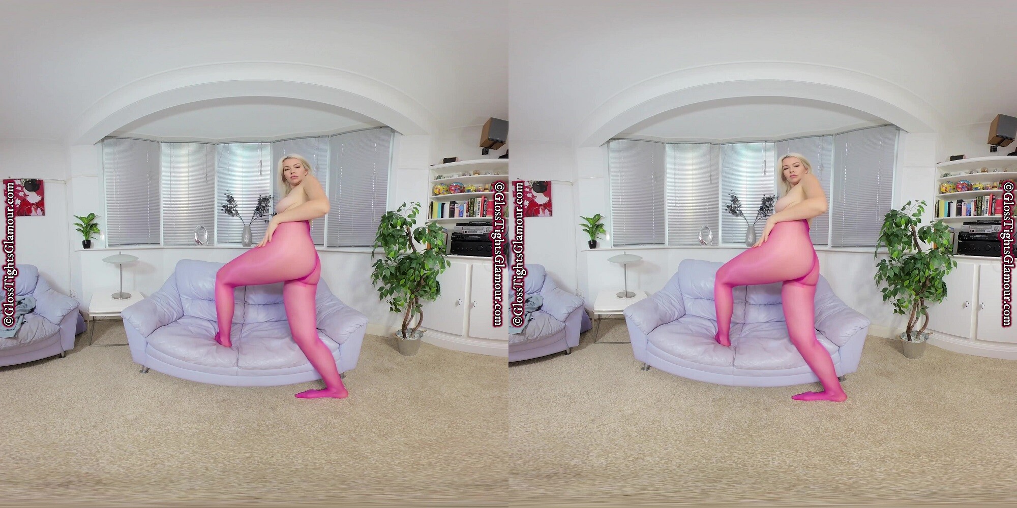 Natural blonde beauty Nicky will blow your socks off and make your jaw hit the floor as you watch this VR video of her wearing a grey dress, without underwear or footwear, to ensure your eyes remain firmly on the prize – namely her colourful sheer glossy pink/fuchsia tights/pantyhose as she strip teases…