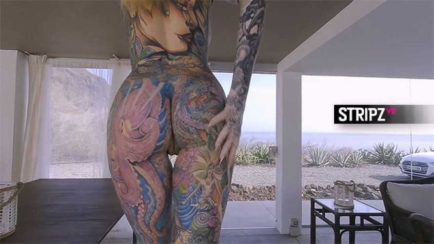 Now, when she starts her solo striptease, it’s like the tension ramps up big time. That slow reveal of her tattooed skin, piece by piece, had me on edge, no lie. It ain’t just a strip; it’s a performance, ya know? The way she teases, with that seductive smile, makes you feel like she’s right there, playing just for you. I must say, the immersive VR tech makes every detail pop—those tats, that confidence, it’s unreal.