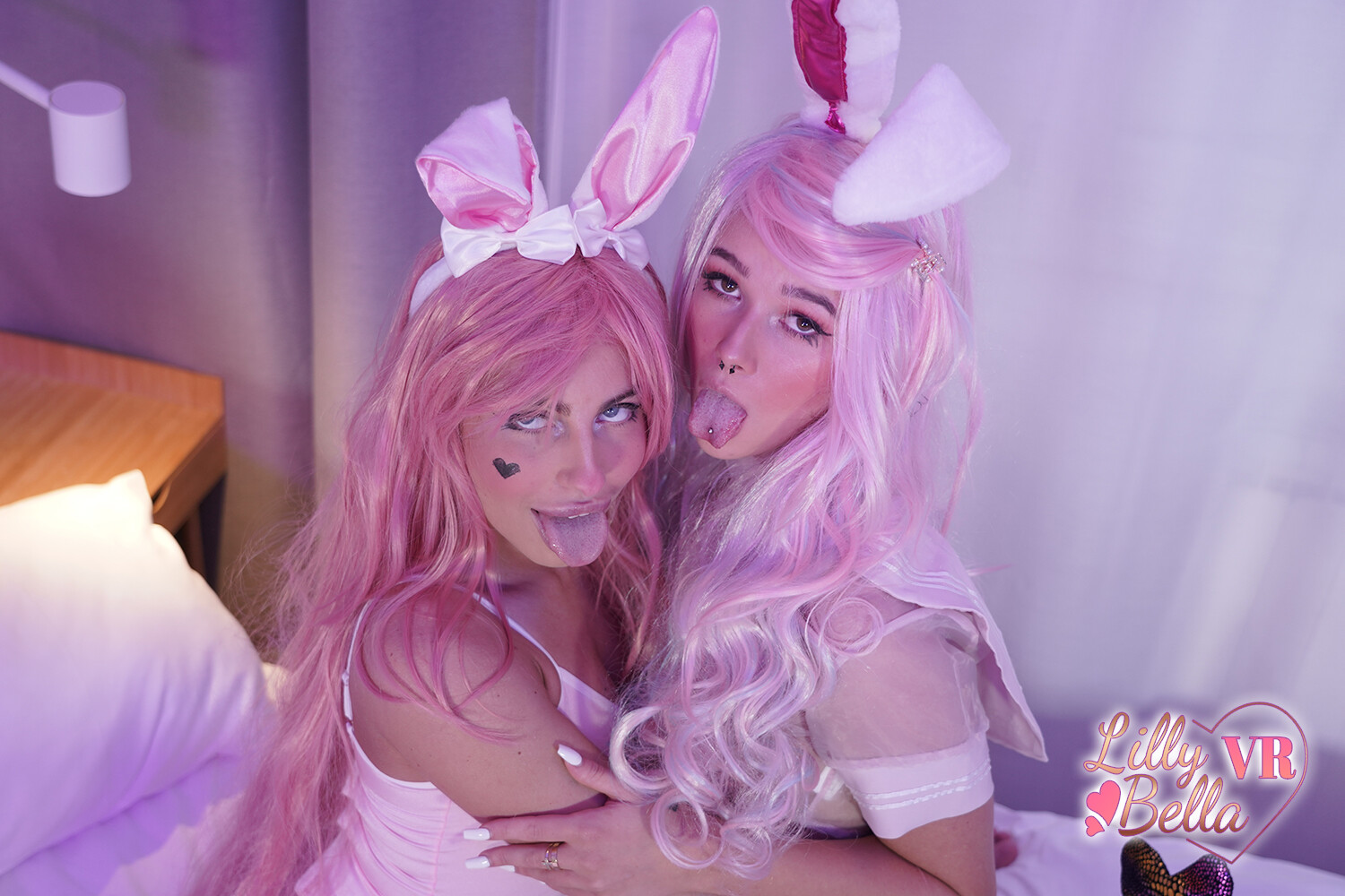 The tension builds quick when they slip into those bunny outfits, and the cowgirl moment? Absolute fire. Lilly’s energy is infectious as she takes control, while Olivia’s reactions just amp up the heat. Then, the switch to reverse cowgirl—honestly, it’s a game-changer, the way they lock eyes with you through the VR lens, it feels so damn real.