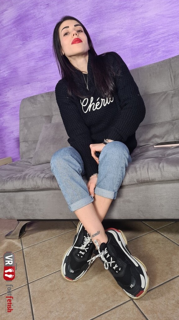 Smoking-hot Petra is talking on the phone with a friend about her daily workout routine. She radiates sex appeal even without showing much skin, and looks stunning in a classic black jumper paired with light-wash jeans. Her fabulous feet are clad in a pair of black and white chunky trainers. The big-lipped brunette takes off her smelly shoes, sniffs them and seductively flaunts her sweaty feet clad in ankle-high black socks. She finally takes off her socks and exhibits her bare feet.