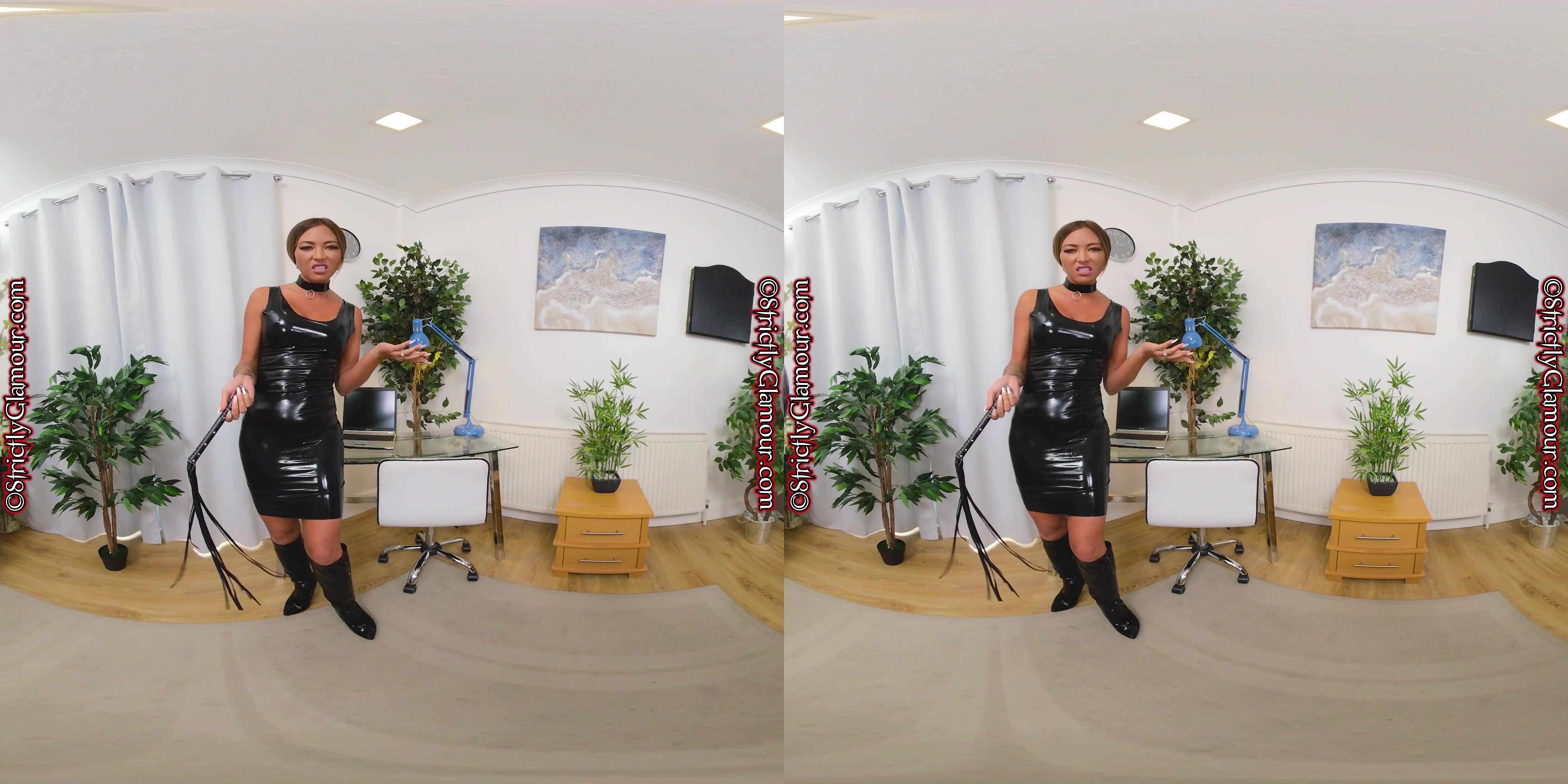 VR Video from shoot with mistress Natalia wearing a black skin-tight latex dress (sans bra), black thong, black knee-high boots, and leather flogger whip in hand, is about to turn your whole world upside down as she taunts and teases you in equal measure – with rewards to those that know their place, in total submission & worship with heads bowed at her feet – and also with plenty of encouragement for you to show your appreciation!