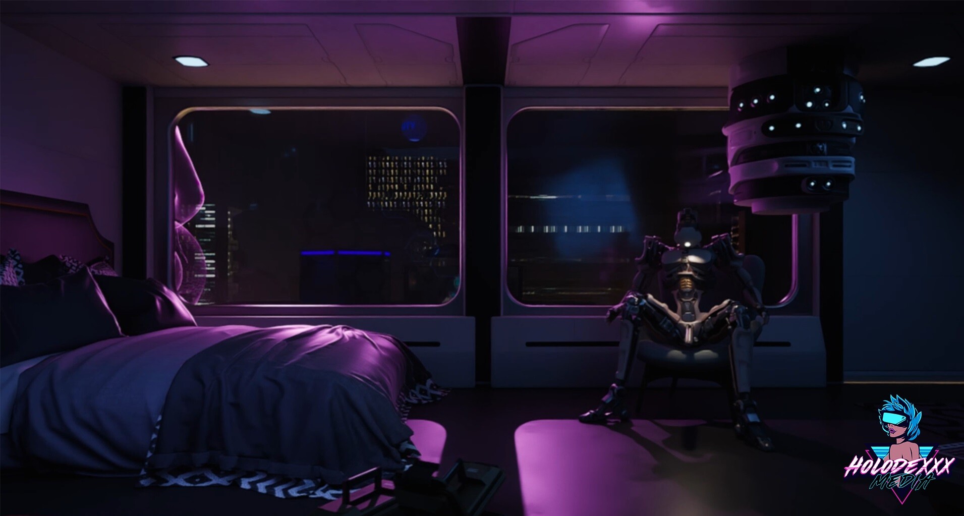 Lady Euphoria (Marley Brinx) is ready for a visit from her Sex Android 3000. Lit by the cyberpunk landscape, watch as Euphoria pleasures her electronic paramour, and then drop to her knees to be fucked doggy-style.