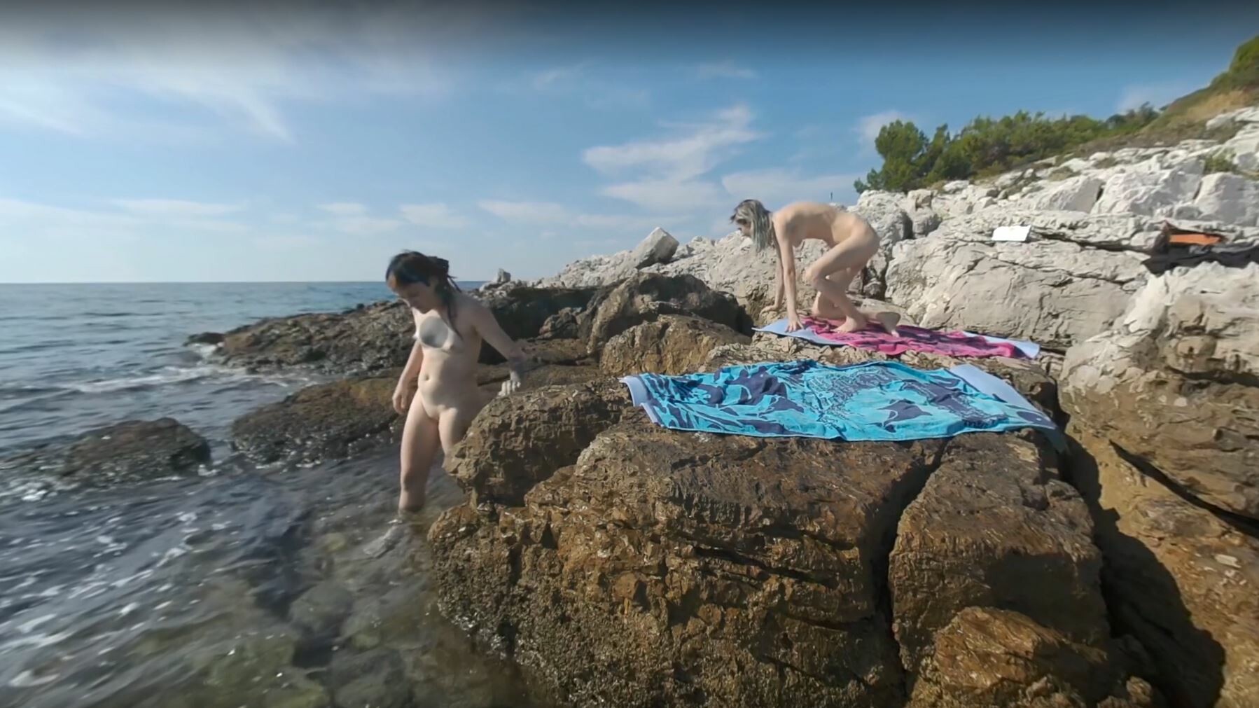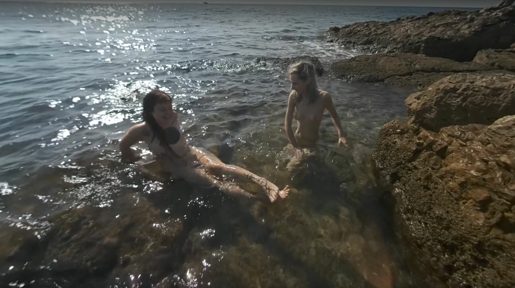 The scene begins with Poppy Brille and her companion strolling along the shoreline, their bodies glistening in the sunlight. They pause at the water's edge, where they slowly undress, revealing their natural beauty. The camera pans out to capture the breathtaking scenery as they engage in a playful skinny dipping session.