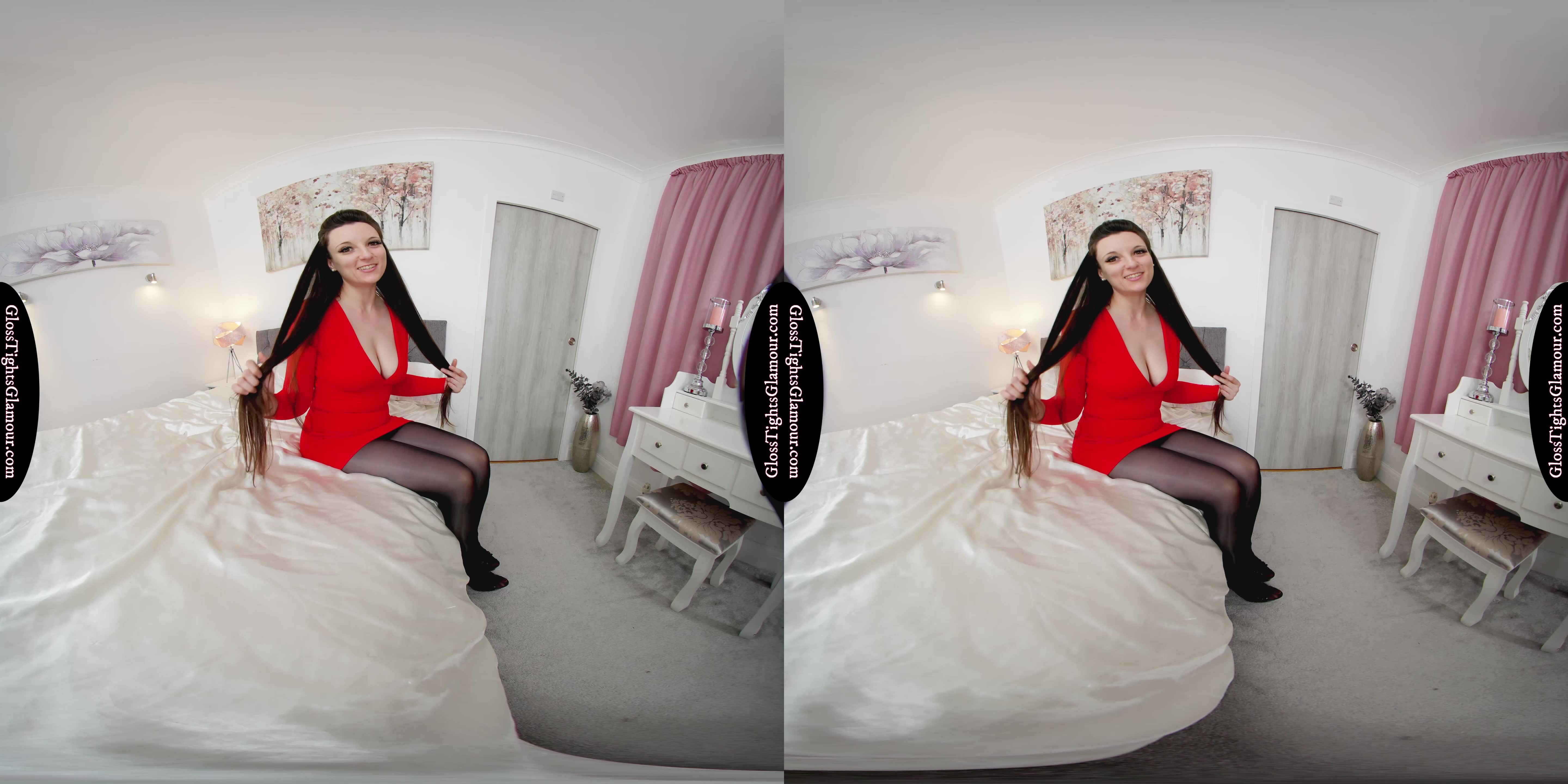 VR Video from shoot with Ivy Rain wearing a stylish red dress (sans bra), black glossy tights/pantyhose (sans briefs/panties), and black high-heeled open toe shoes that stay on throughout, in an exhilarating naughty tease to implied nude that provides close up experience of her legwear, and of course, much more besides!