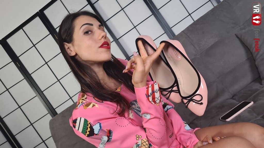 Breathtakingly gorgeous Petra is such a queen and exudes seductive vibes in a pink mini dress, slightly fitted with long sleeves. She is wearing a lovely pair of pink bow-topped ballerina flats, and her sexy feet are delicately wrapped in flesh-coloured midcalf nylon socks. The big-lipped hottie teases you with some shoe dangling, takes off her ballerina flats and nylons, sniffs them, seductively flaunts her amazing feet and puts on her shoes again.