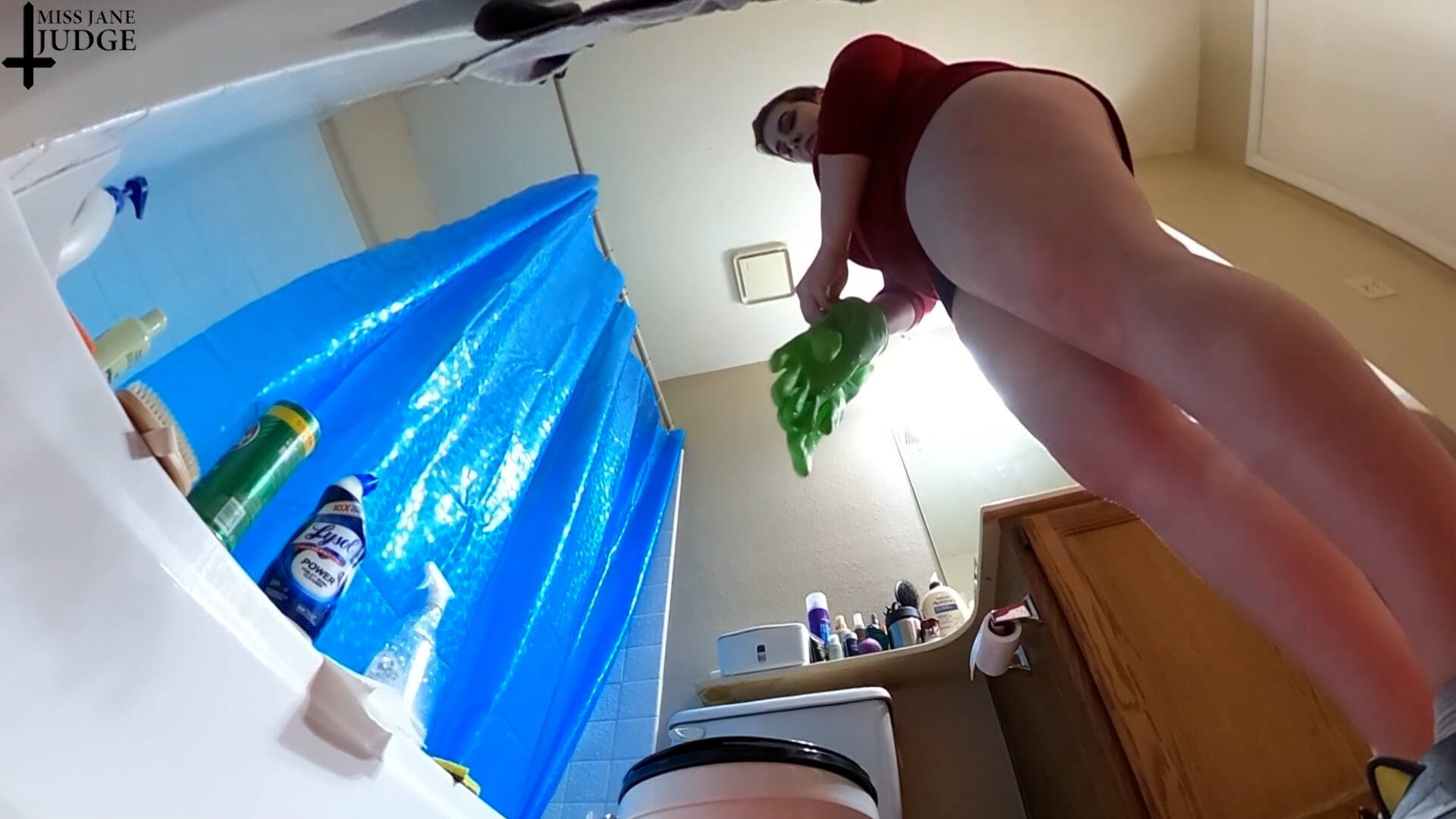 Jane is ready to give her bathroom a top to bottom scrub! You watch as she cleans it out, puts on her bright green rubber gloves, and gets to work. Her big tits and thick thighs jiggle as she scrubs the countertops, not noticing you as you hide just out of sight. Her short dress rides up and you see her ass hanging out, her body towering above you as she nearly steps on you cleaning the toilet. She scrubs and cleans, never noticing the tiny eyes watching her, seeing more than they should… She finishes the whole bathroom completely unaware of your presence!