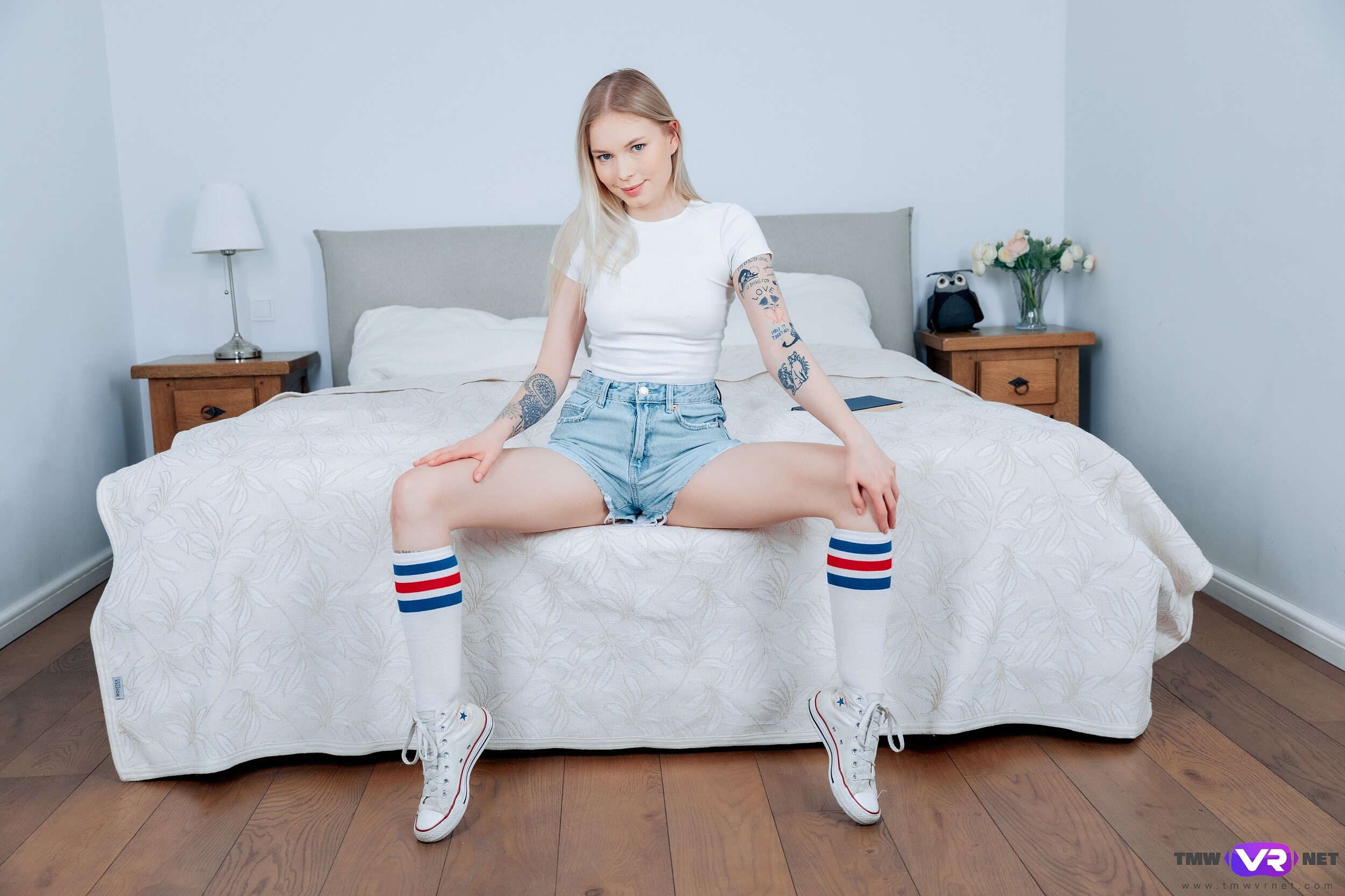Beautiful Mimi Cica relaxes in bed with her favorite book in her hands. She turns around to welcome the dude and to ask him a couple of questions about his day. She tells him she is more than happy to see him and to prove her words she tells him about her fantasies, tells him she is wearing no panties under her tiny shorts, and takes off her top to play with her yummy tits.